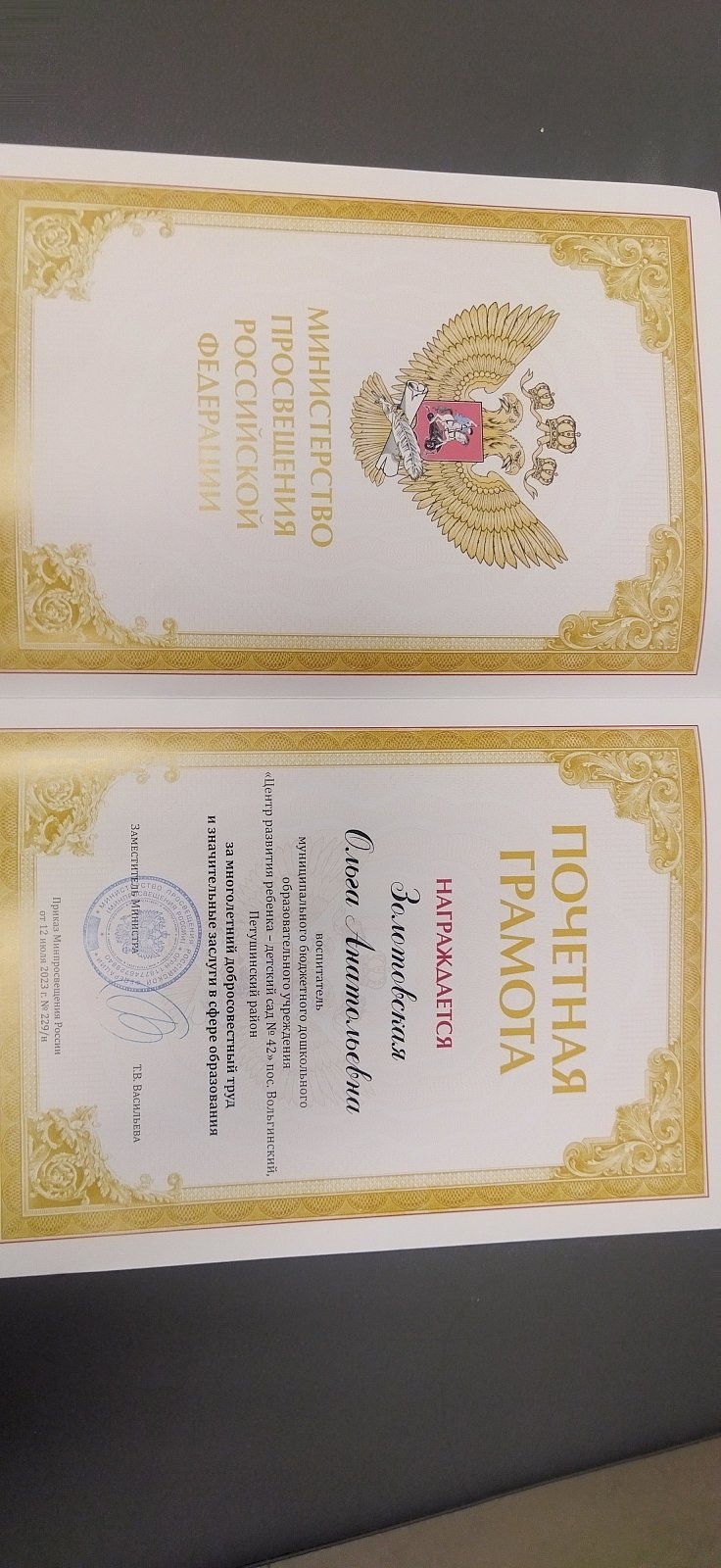 Поздравляем наших уважаемых педагогов , Золотовскую Ольгу Анатольевну и Воронкову Наталью Спартаковну с получением почетных грамот Министерства Просвещения РФ и Министерства Образования Владимирской области